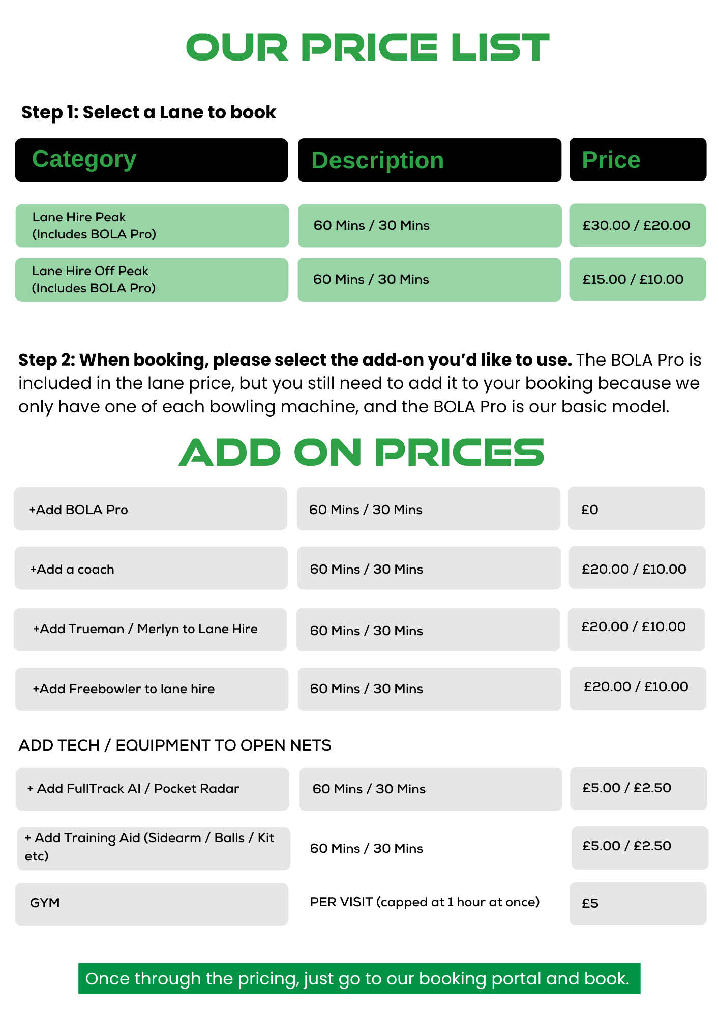 Below, you’ll find our full price list, lane hire rates are shown first, followed by the available add‑ons.